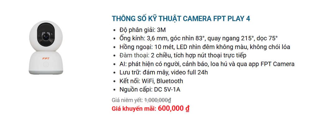 1. FPT Camera Play 4 là dòng thiết bị FPT Camera chuyên dụng để lắp đặt trong nhà với chuẩn hình ảnh 3MP. Tích hợp nút gọi thoại trực tiếp, có loa hú âm điệu chủ động, gọi khẩn cấp từ camera lên App điện thoại. Video lưu trữ FULL 24/7, clip AI Human Detection.2. FPT Camera IQ4S là dòng thiết bị FPT Camera chuyên dụng để lắp đặt trong nhà và ngoài trời vừa ra mắt năm 2025. Phạm vi hồng ngoại 30 met, đèn rọi Floodlight LED, ban đêm có màu. Lưu trữ đám mây bảo mật 24/7, Human Detetion.3. FPT Camera Play 3 là dòng thiết bị FPT Camera chuyên dụng để lắp đặt trong nhà với chuẩn hình ảnh 3MP. Góc xoay ngang 355 độ và xoay dọc -10 độ -50 độ bao quát toàn diện. Hỗ trợ đàm thoại 2 chiều tiện lợi.